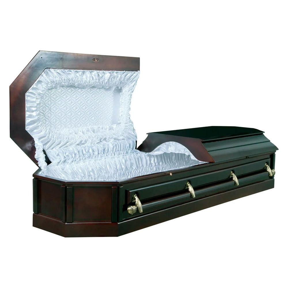 Элитный двухкрышечный гроб из массива дерева. Изделие представлено в двух цветах: классический орех и благородный венге. У данной модели верхняя крышка открывается для прощания, а нижняя остаётся закрытой. Свое название гроб приобрел благодаря уникальной форме восьмиугольника. Ручки двухкрышечного гроба крепятся по всей длине изделия, что облегчает процесс переноса гроба. Внутренняя драпировка гроба восьмигранника обита атласной стежкой.